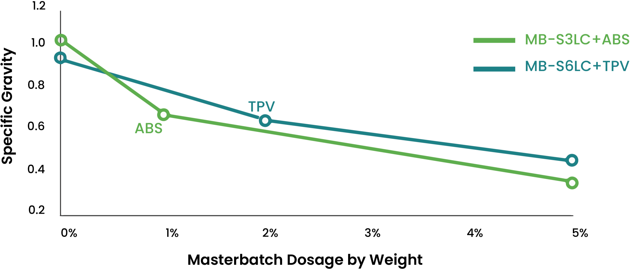Kureha Series-S Masterbatch (MB) is a 50/50 blend of Series-S microspheres with LDPE. When molding by blending with pellets, we recommend masterbatch for its excellent dispersibility. As a guideline for additive amount of masterbatch, we recommend 2%-3% for weight reduction and up to 2% to reduce sink marks.